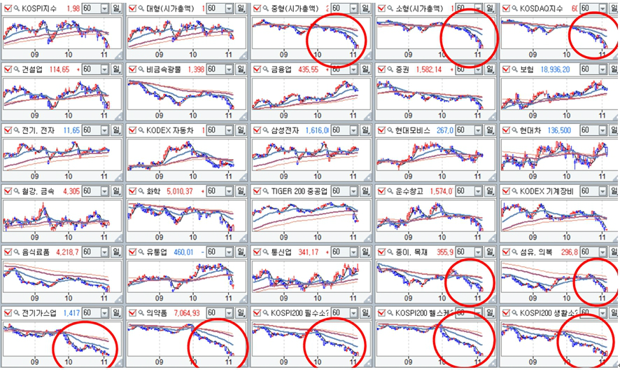 또한 음식료, 유통업, 의류와 제지, 생활소비재와 필수소비재 등 대다수의 업종은 과매도권에 진입해 있으며 연중 저가 매수할 수 있는 가격권에 진입하여 있다.