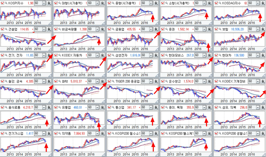단기 변동을 무시한 월간으로 보는 업종별 추세는 다음과 같다. . 주가가 급락했던 기업은 5년 평균 가격인 60월 평균에 이르면서 지지권에 근접하여 있고, 장기 하락했던 경기 민감주는 바닥을 벗어나 점차 상승이 이어지는 국면이다.
