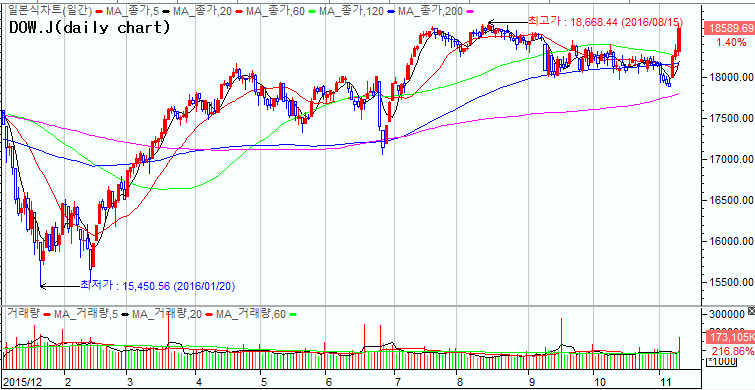 를 보였으며 미국시장 역시 1% 이상의 강한 상승세로 마감을 하였다. (이하 다우지수 차트참조)