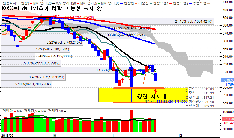 외국인.기관 양매도가 나온 코스닥시장은 10.93p나 급락하면서 609.33p 로 마감하였다.