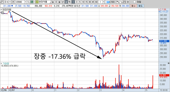 이처럼 늑장 공시 사건으로 한미약품에 대한 투심이 악화되어있는 상황에서, 오늘 오전 또 다시 ‘찌라시’ 를 통해 한미약품이 얀센에 수출한 1조원 규모의 당뇨병 치료제 임상시험이 중단 됐다는 소식이 전해지면서 개장 이후 곧바로 주가가 하락하기 시작했고, 이어서 언론에서도 관련 소식을 다루면서 장중에는 –17.36% 까지 급락을 했습니다.
