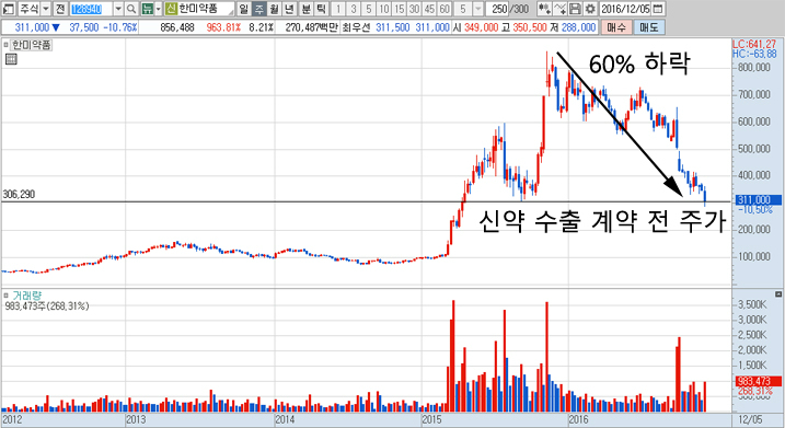 기술적 분석상으로도 최고점 대비 60% 이상 하락하며, 2015년 신약 수출 계약들을 체결하기 이전 수준으로 되돌아 온 상황 입니다.