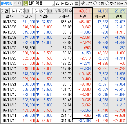 지난 9월 30일 독일 제약업체 베링거잉겔하임과 계약한 8천500억원 규모의 기술 수출이 해지 되었다는 악재 정보를 늑장 공시한 이후, 기관과 외국인의 매도세가 이어지면서 개인들이 물량을 받고 있는 상황 입니다.