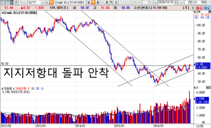 11월 30일 석유수출국기구(OPEC)가 2008년 이후 8년만에 감산 합의를 하면서 유가는 당일 8% 급등을 시작으로, 2015년 이후 형성된 지지저항대인 50달러 돌파 후 안착을 시도하고 있습니다.