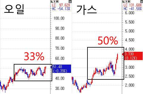 하지만, 독특한 점은 오일의 상승폭보다 가스의 상승폭이 더욱 크다는 것인데, 최근 6개월간의 가격 흐름에서 오일은 33% 상승한 반면, 가스는 50%의 상승을 보여주고 있습니다.