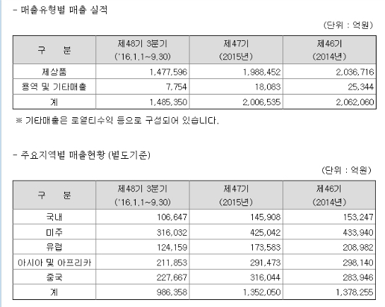 동사의 2016년도 매출은 순매출액 기준으로 148조5350억이며 CE부문이 33조 4097억 22.5%