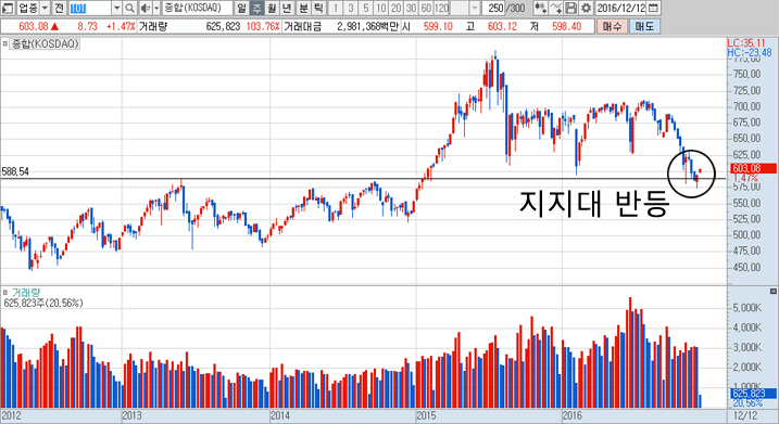 그 동안 코스피의 상승폭에 비해 부진한 흐름을 보였던 코스닥이, 중장기 지지대를 밟고 오랜만에 사흘간의 상승을 이어갔습니다.