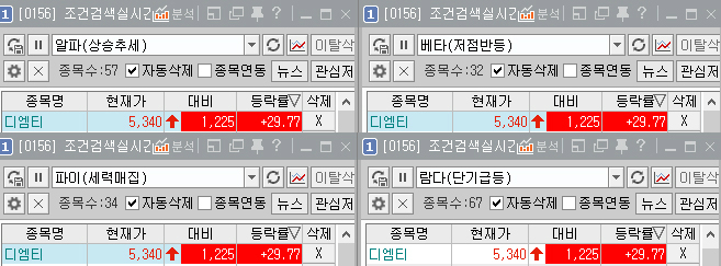 오늘 상한가에 들어간 종목 중 가장 강한 종목은 디엠티 였는데, 급등주 검색기 알파벳의 4가지 검색기 모두에서 동시에 포착이 되었습니다.