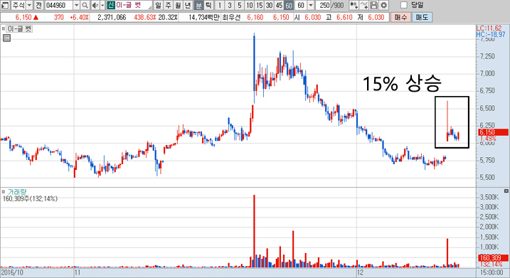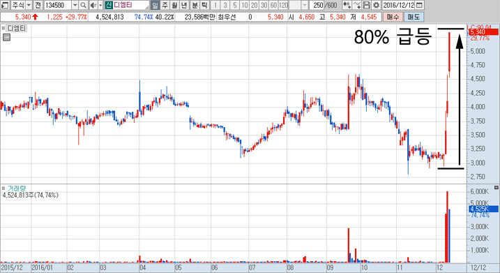 4가지 검색기 모두에서 동시에 포착되는 경우는 흔치 않은 경우인데, 이미 12월 8일과 9일에도 급등주 검색기 알파벳에 포착이 되었던 디엠티는, 4일만에 저점에서 고점까지 80%의 급등을 보여주고 있습니다.