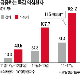 초중고등학교를 중심으로 빠른 속도로 독감이 확산 되면서, 독감 의심환자가 1997년 독감 감시체계 도입 이후 역대 최대치를 기록하고 있습니다.