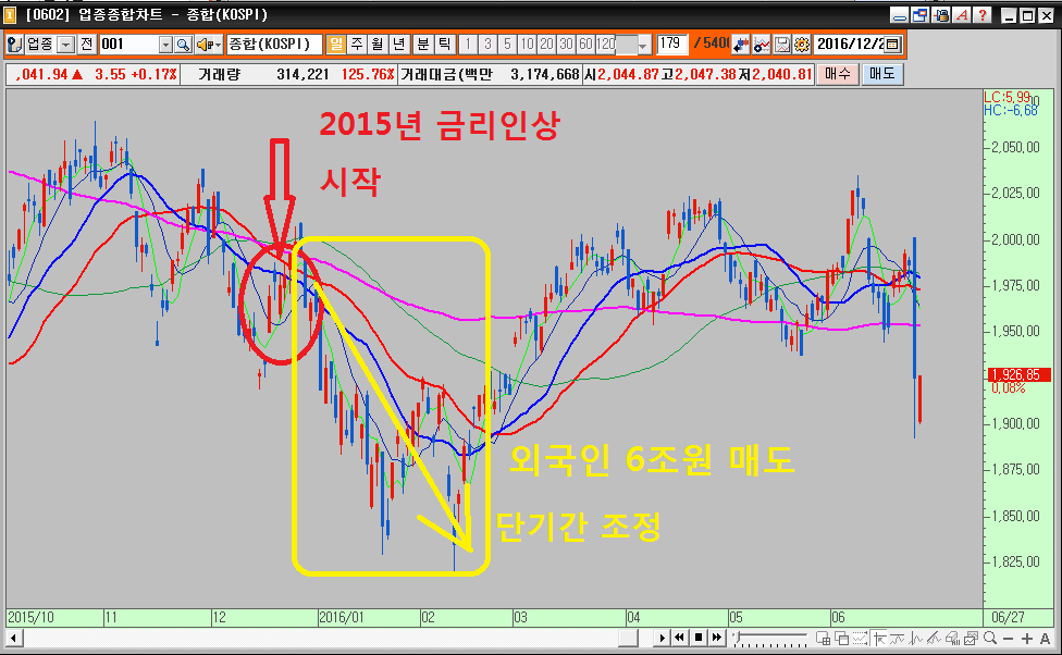 작년 금리인상 때에는 연말 배당을 노리고 들어온 단기자금의 이탈을 시작으로 하락세가 시작되는 모습이었습니다.