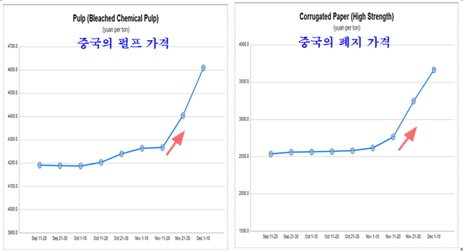 쥬라기: 11월 하순 들어 중국에서 펄프와 고지(폐지)가격이 오르기 시작합니다.