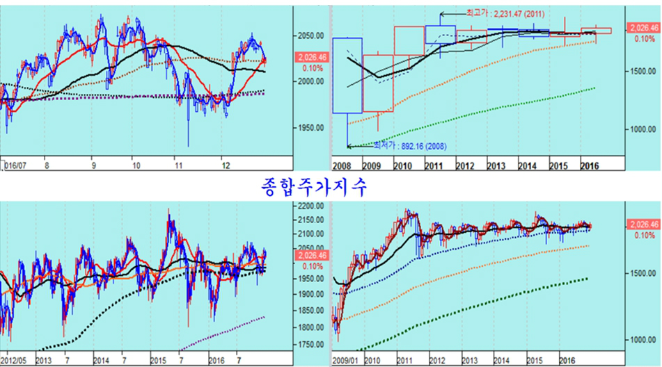 아쉬움 속에 29일을 마지막으로 2016년 주식 시장이 대단원의 막을 내렸다. 종합주가지수는 연초부터 하락으로 출발하여 반기 말 브렉시트 우려 장세와, 연말 미국 대선 불확실성과 대통령 탄핵, 그리고 금리 인상에 대한 부담감으로 조정을 거쳤으나 결국은 양봉 마감하며 3.32% 상승에 그쳤다.