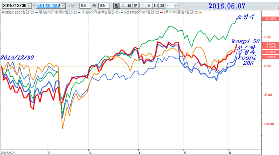 주가는 6월 초까지만 해도 대형주와 중소형 코스닥이 비슷한 움직임을 보이며, 거래소 소형주가 8%로 가장 앞선 모습을 보였다.