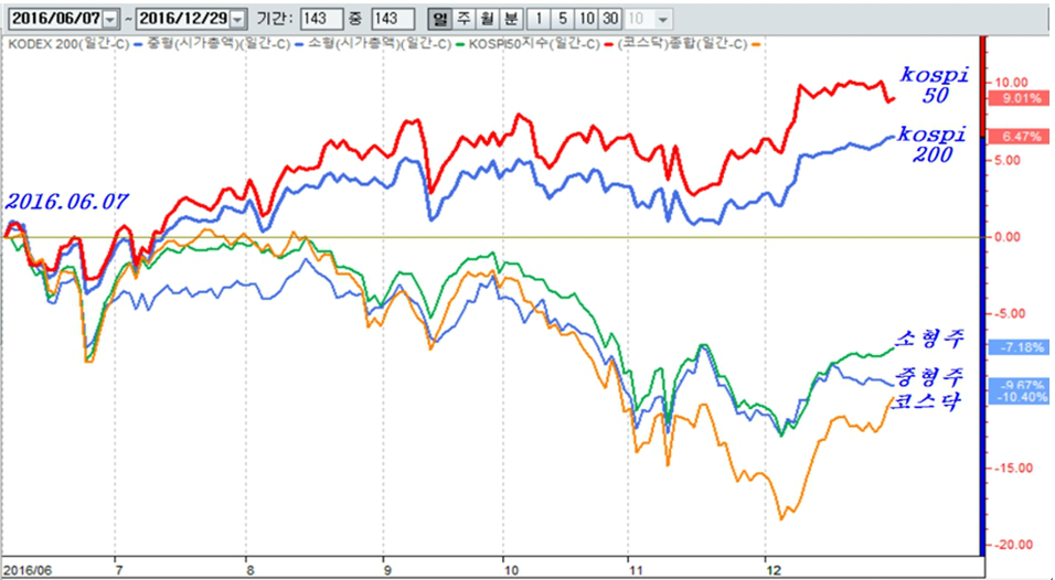 종합주가지수가 3.32% 상승에 그쳤지만 Kospi200지수는 8.17% 상승하여 kodex 200을 사서 모으는 내국인들도 적지 않는 수익을 냈고, kospi50 지수의 상승률은 13.18%에 이른다. 그러나, 중형주 지수가 7.52% 하락하고 코스닥 지수도 7.46%가 하락하여 투자 대상과 전략에 따라 극명한 대조를 이루는 한 해가 되었다.