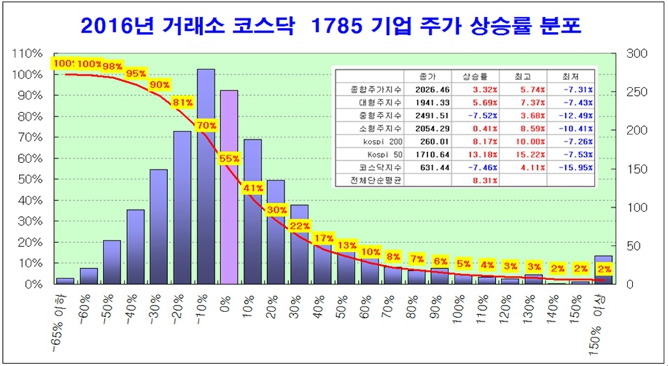 실제 2015년 연말 주식을 사서 1년간 보유했을 때 등락률을 보면 등락 분포가 손실쪽으로 치우쳐 있다. 거래소와 코스닥 보통주 1785개 전체 기업을 대상으로 2016년 상승률 분포를 분석해 보면 아래와 같다.