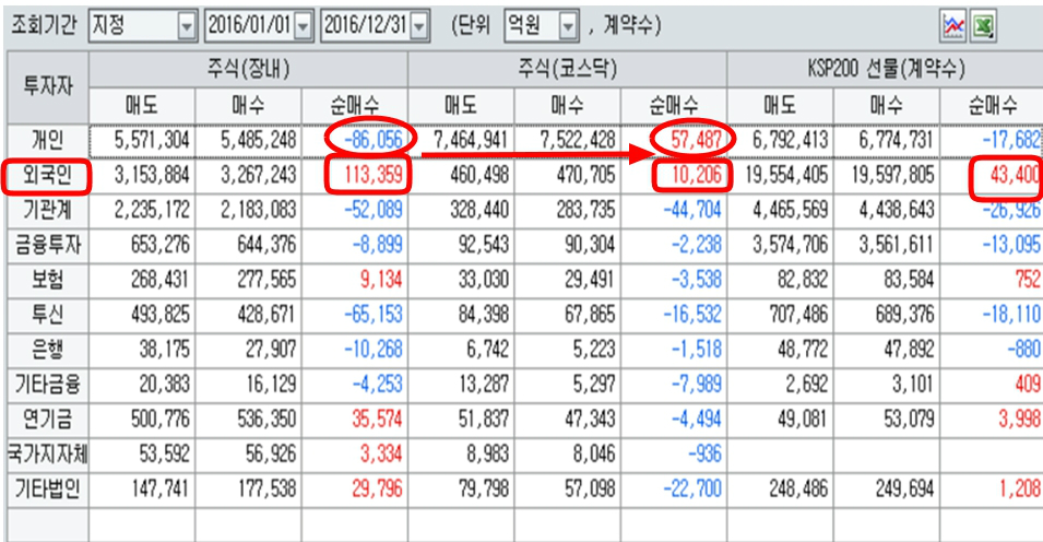 이 때문에 지구촌 경기에 맞춰 투자하는 외국인은 올 한해 11조 3000억원의 거래소 주식과 1조원의 코스닥 주식 등 주식을 독차지하며 쓸어 담았고, 국내 경기를 기준으로 주식 시장을 바라 본 개인과 기관은 대규모 물량을 처분하는 결과를 나타냈다. 사실 개인은 직접투자나 간접투자인 펀드나 2008년 이후 최저 비중이 되어 있고, 국내 기관도 연기금과 기업 자사주를 제외하면 거의 주식을 매도하고 오히려 공매도 포지션을 갖고 있다.