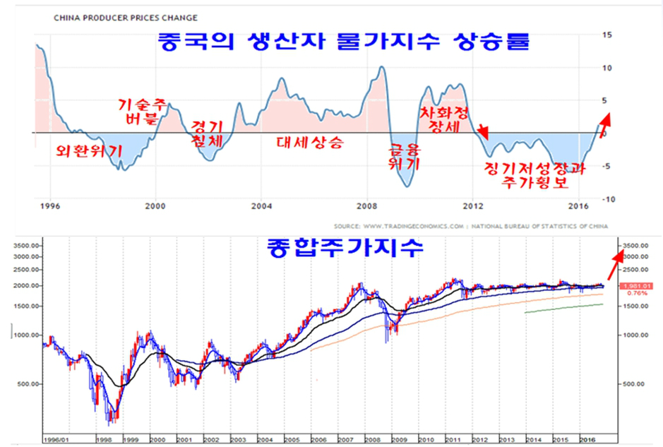 세계 원자재 수요를 결정할 능력이 있는 중국의 생산자 물가지수가 오르면 한국의 주가는 대세 상승을 하고, 중국의 생산자 물가자 하락하면 한국은 주가 대세 하락이 나타난다. 2011년부터 중국의 물가 하락을 따라 장기간 저성장과 경기민감주 주가 하락으로 정체 상태에 있던 종합주가지수는 2016년 들어 중국의 생산자 물가가 오르면서