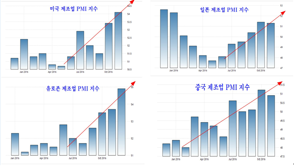 내년 이후의 시장을 보려면 지구촌의 물가와 경기를 보면 좋다. 금융위기 이후 8년 이상 침체를 겪은 지구촌 주택경기가 점차 회복으로 돌아서고, 그에 따라 주택 건설을 위한 건자재 생산이 늘면서 세계 제조업 경기가 회복되고 있다.