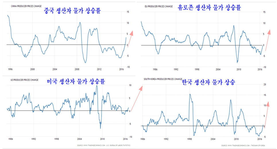 지구촌 경제는 중국이 2014년 말부터 금리를 낮춘 후 지난해 연말 이후 통화 공급을 크게 늘려 경기를 부양하면서 중국의 주택가격이 오르고 건설이 살아나고 있다. 이 때문에 전세계적으로 원자재 수요가 늘면서 원자재 가격이 오르고 있고, 원자재를 가공하여 판매하는 기업들의 제품 판매가격이 덩달아 오르면서 기업의 매출과 이익이 늘고 있다.