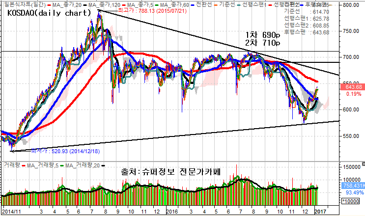 코스닥지수는 기술적으로 1차 690p 전후까지 반등 가능성이 열려있으며 동 지수대 돌파시는 최근