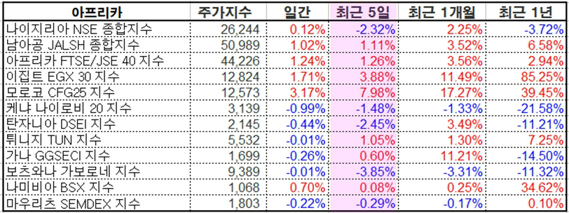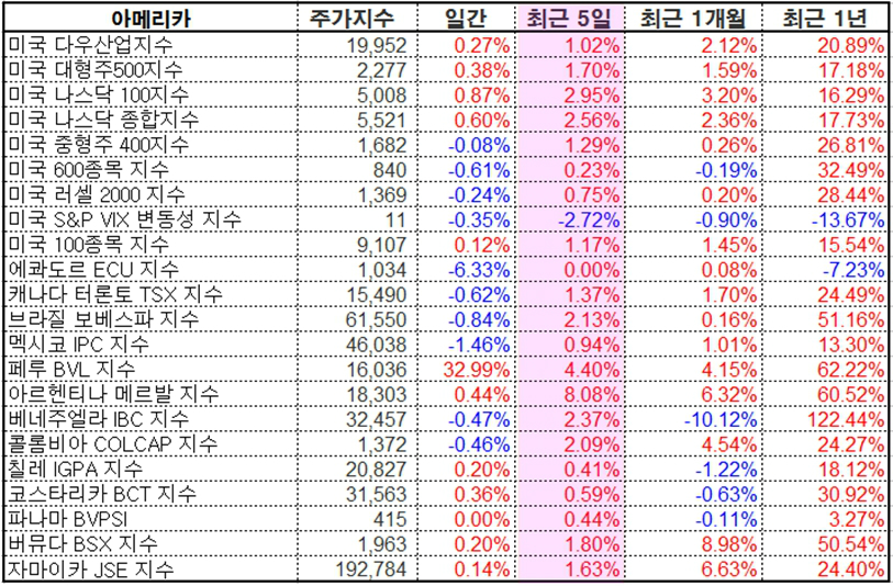 미국 시장은 대형주 1.7%, 나스닥 종합지수 2.56%의 상승을 하였고, 중남미 대다수의 국가들도 활발한 상승이 이어지고 있다.