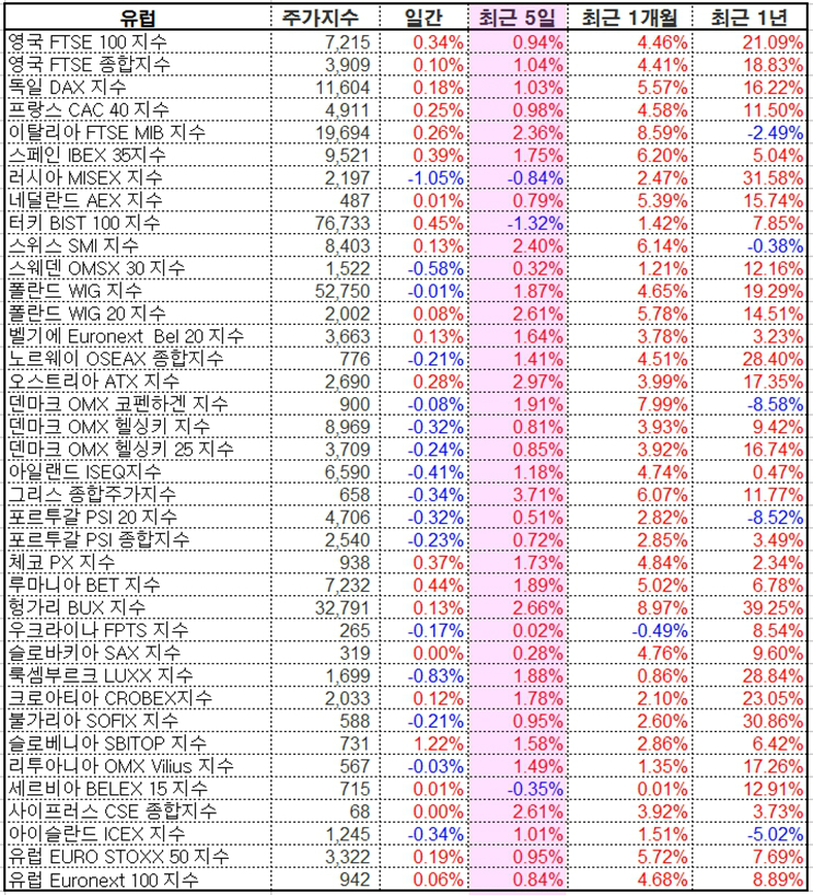 지난 한해 지루한 정체 국면이 이어졌던 유럽 시장은 지난 12월 파생상품 만기 이후 상승이 활발하다. 유럽 FTSE 100 종목 지수는 1개월전 대비 4.46%, 독일 DAX 지수가 5.57%가 상승한 가운데 올해 첫주 각각 0.94%와, 1.03% 상승하였다. 유럽시장 전반이 매우 활발한 상승을 하고 있다.