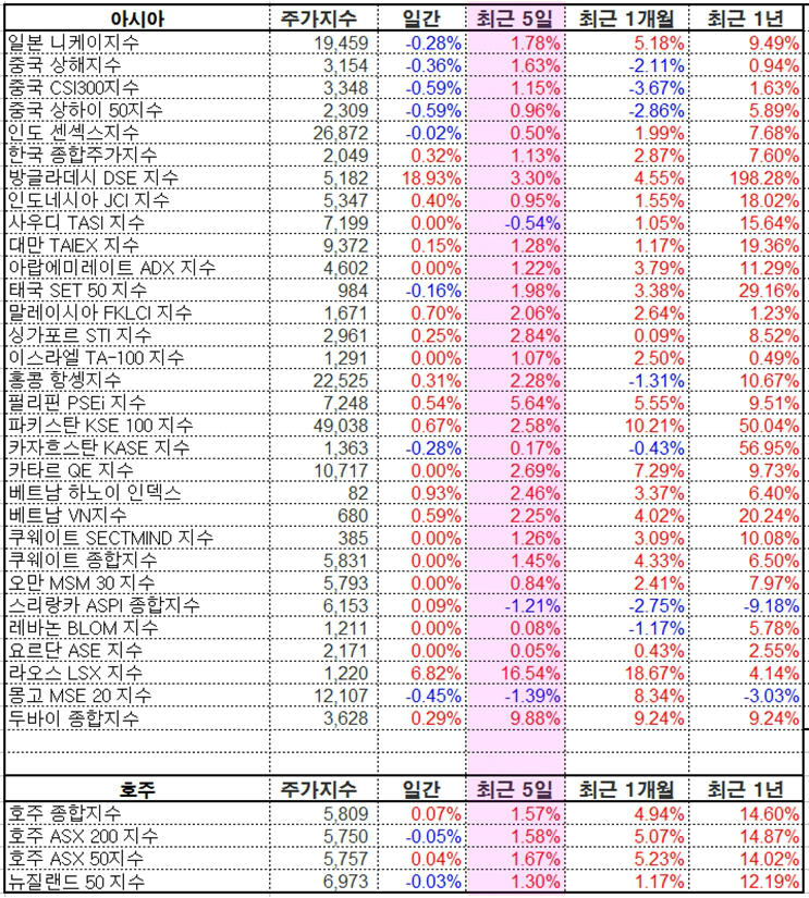 아시아 국가 역시 새해 출발이 활발하다. 지난해 연말 하락이 이어졌던 중국 중시가 1.63%오르는 등 일본, 중국, 한국이 모두 1% 넘는 상승을 하였고, 태국, 말레이시아, 싱가포르, 파키스탄, 카타르 베트남 등은 2%가 넘는 상승을 하였고, 방글라데시 3.30%, 필리핀 5.64%, 두바이 9.88%, 라오스 16.54% 등 새해 시장 흐름이 거세다.