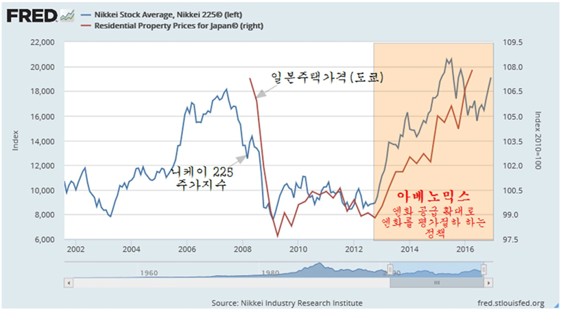 물가상승률을 2.0%로 끌어 올리는 통화정책인 아베노믹스와 함께 일본은 주택가격이 주가가 오르며 20년 저항을 돌파했고, 청년 실업률이 획기적으로 낮아지는 등 부동산 시장, 주식 시장을 포함한 경제가 인구 감소와 고령화의 함정을 벗어나고 있다.