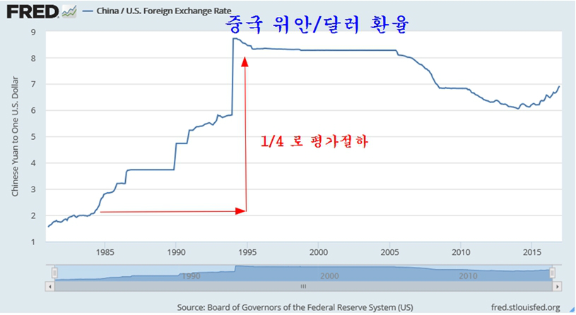 그렇다면 위안화 하락으로 일본이 저성장에 빠져들 때 한국에는 영향이 없었을까? 당연히 위안화 하락이 일본 경제에 미친 영향은 한국 경제에도 고스란히 전해졌다. 중국이 위안화를 평가절하하면서 80년대 초반 1위안 당 400원대에서 거래되던 원화는 1994년말 1위안당 100 위안으로 1/4로 낮아졌다.