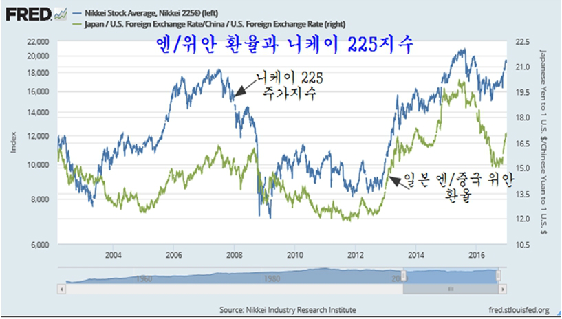 물론 부동산 버블 후 일본 정부의 가계 부채를 줄이기 위한 정책과 인구 감소의 영향도 있었겠지만 무엇보다 일본의 저성장을 이끈 것은 중국 위안화 평가절하에 따른 엔/위안 환율의 드라마틱한 변화에 그 원인이 있다. 아래 일본 주가지수(니케이 225지수)와 엔/위안 환율의 변화를 보면 이런 관계를 알기 쉽다.