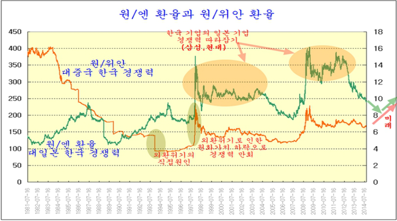 ㅇ 한국은 그간 위안화와 엔화에 대한 원화 가치가 낮아지면서 저성장에서 벗어날 여건이 마련되고 있다. 90년대 저성장 이후 우리 기업은 세계로 진출하여 글로벌 기업이 되어 경쟁력이 강화되었고, 수출 경쟁국이었던 중국이 거대한 소비시장으로 성장하면서 일본과 한국에게 새로운 성장의 기회를 주고 있다.
