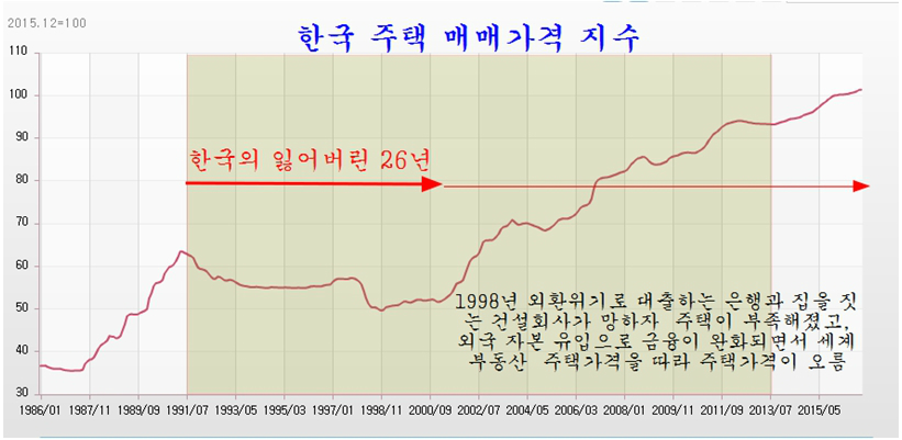 당연히 1990년대 한국도 저성장과 저물가와 주택가격 하락 정체와 주가 정체를 겪어, 일본과 함께 잃어버린 세월을 함께 보내야 했다.