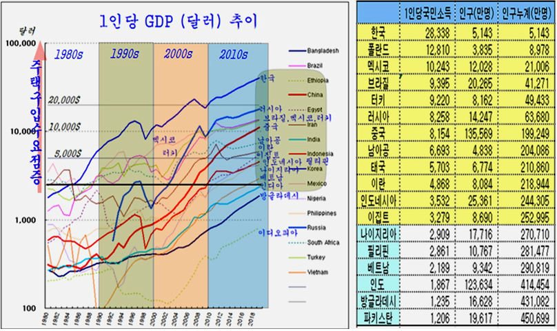 ㅇ 한국 경제의 성장은 세계 경제의 성장 여부와 무역 경쟁국인 대중, 대일 무역 경쟁력이 결정한다. 2017년 현재 세계 경제는 선진국 인구에 더하여 40억 인구를 가진