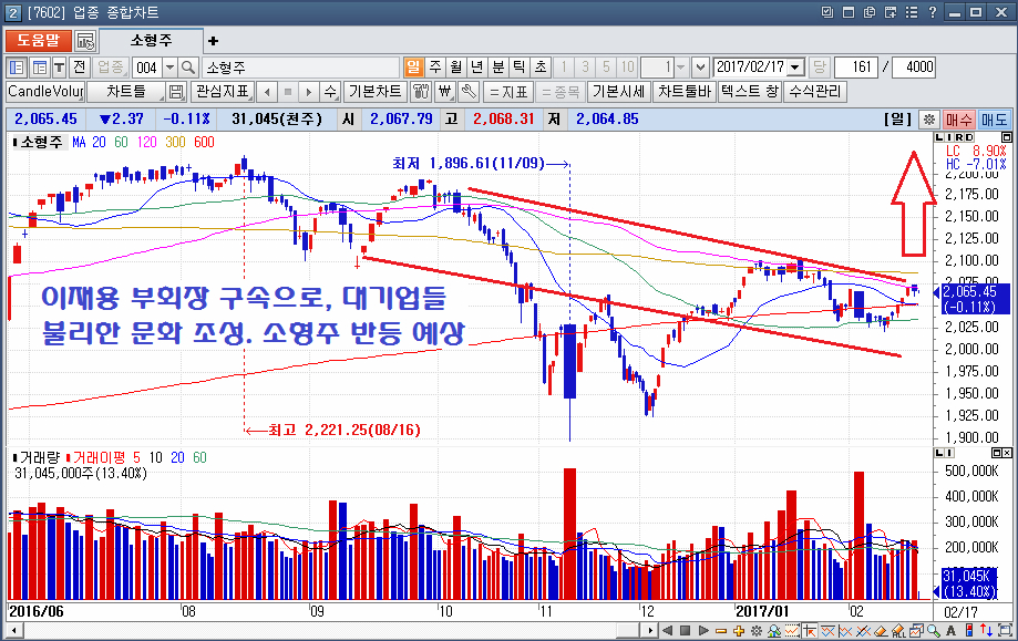이제는 실력이 있으면, 중소기업도 급격히 성장하는 때입니다. 여러분, 이 시대, 공정한 대한민국을 맞아, 성장하는 중소형주에 투자하시기 바랍니다. 2016년까지는 대형주의 상승, 소형주의 약세였다면, 2017년 2월 부터 중소형주의 랠리에 기대를 걸어봅니다.