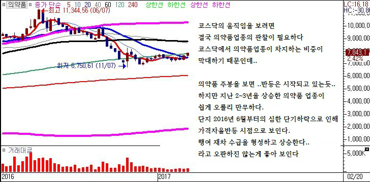 코스닥 시장을 읽기 위해선 필연적으로 의약품 업종의 차트를 살펴봐야 한다.