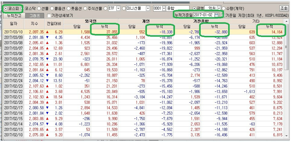 코스피 : 2017년 1월 2일 ~ 3월10일 까지 누적 포지션
