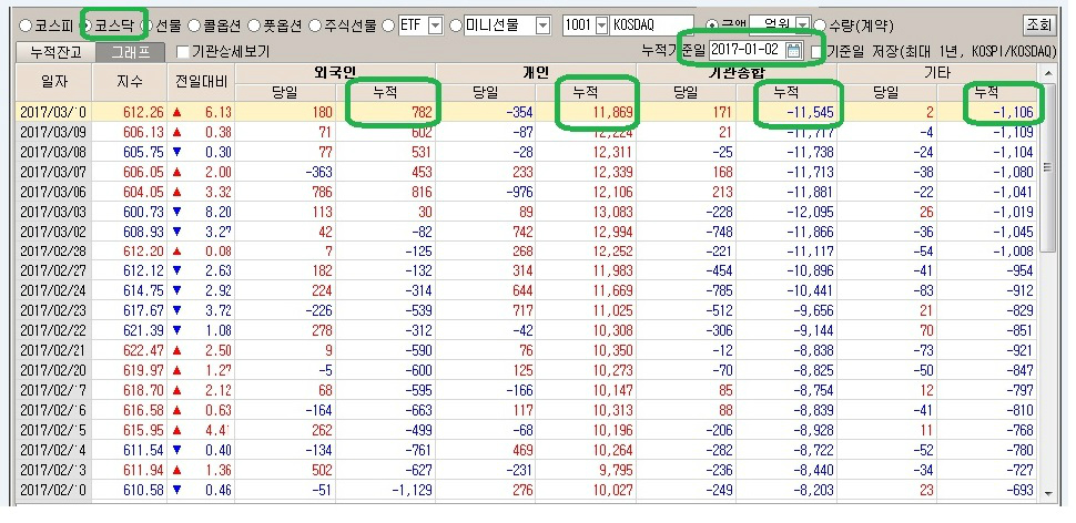 코스닥 : 2017년 1월 2일 ~ 3월10일 까지 누적 포지션