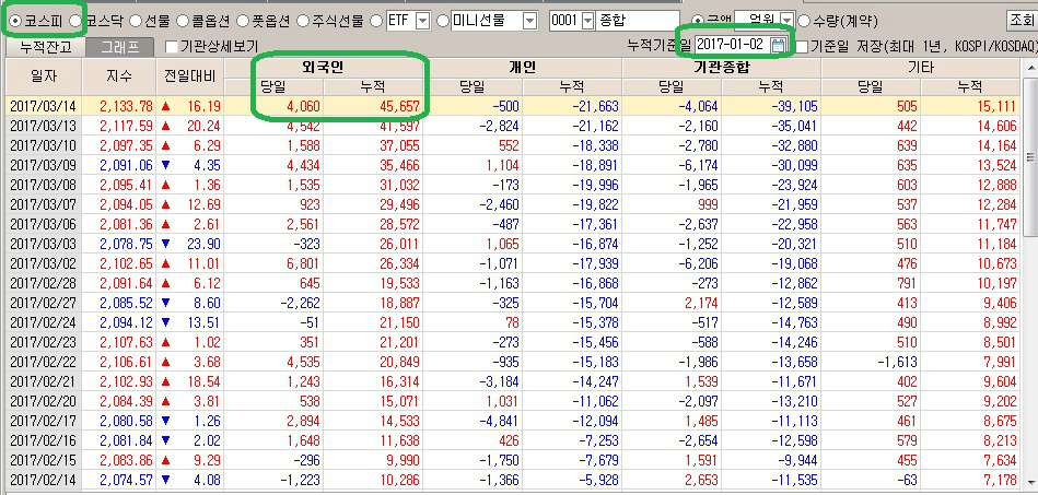 2017년 1월 2일 ~ 3월 14일 누적 외국인 코스피 현황.