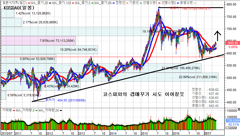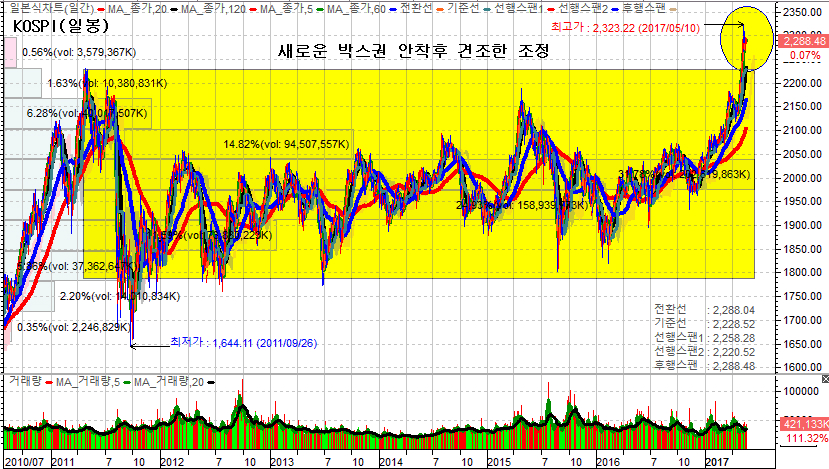 주식시장이 외풍에도 흔들림 없는 견조한 조정이 이어지고 있다. 외국인들이 양시장과 코스피200 선물시장에서 3일연속 순매수를 이어가면서 수급이 안정되는 가운데 코스피지수는 사상 최고가 경신이후 새로운 박스권대에 진입한후 숨고르기 과정을 거치고 있지만 가격조정이 아닌 기간조정의 ?름이 이어지고 있다. (아래 코스피지수 참조) ![]() 향후 코스피지수는 일정분 이격 좁히기가 진행된 이후 추가적인 상승세를 이어갈 가능성이 높아지고 있다. 지난 분석글에서도 언급한바 있듯이 최근 7여년간의 박스권인 1800~2200 구간을 상향 돌파함에 따라 새로운 박스권역인 2200~2600 구간에 진입한 것으로 보아야 한다. 물론 현시점에서 2600이라는 박스권 상단을 설정하는 것은 시기 상조이다. 다만 기술적으로보면 그렇게 설정 수도 있다는 것이다. 코스피지수에 비하여 코스닥지수는 상대적으로 오르지 못했다. 사상 최고치 경신은 커녕 이제 겨우 바닥권 탈피하는 수준에 불과하다. 따라서 일정분의 갭 메꾸기 과정이 전개될 가능성은 높다. 최근 코스닥시장에서 매수강도를 강화하는 외국인의 수급 역시 우호적인 흐름이다. ![]()