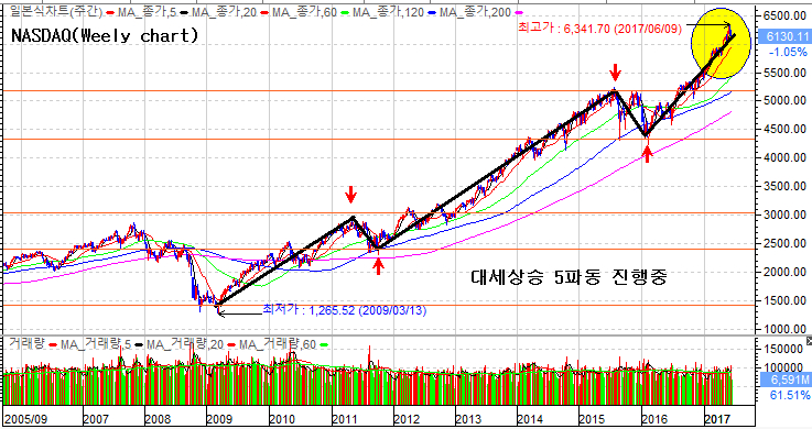 미 나스닥지수는 기술적으로 대세 5파의 진행선상에 있으나 추가상승의 여력은 커지 않아 보입니다.