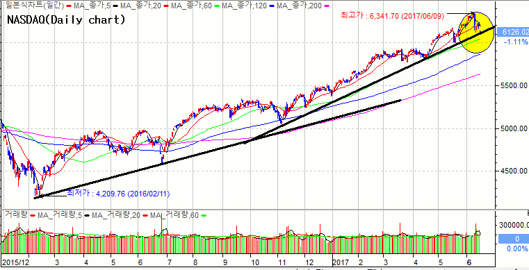 기술적으로 나스닥지수 일봉은 추세적으로 상승강화 모형으로 진행중이었으나 최근 추세대에서 지지여부를 테스트하고 있는 상황입니다.