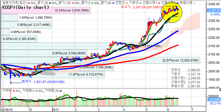 최근 외국인들은 국내시장에 대한 순매수 규모가 급감하면서 코스피지수의 상승탄력성은 둔화되고 좁은 박스권안에서 등락을 보이고 있습니다. 특히 지난 5월이후의 지수 급상승으로 이평과의 이격이 많이 벌어진 부분도 부담적인 부분입니다.