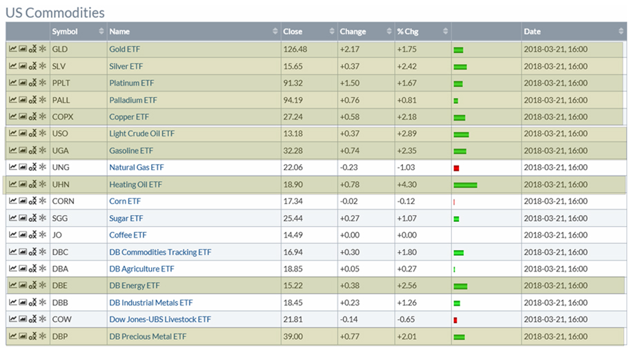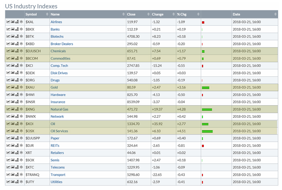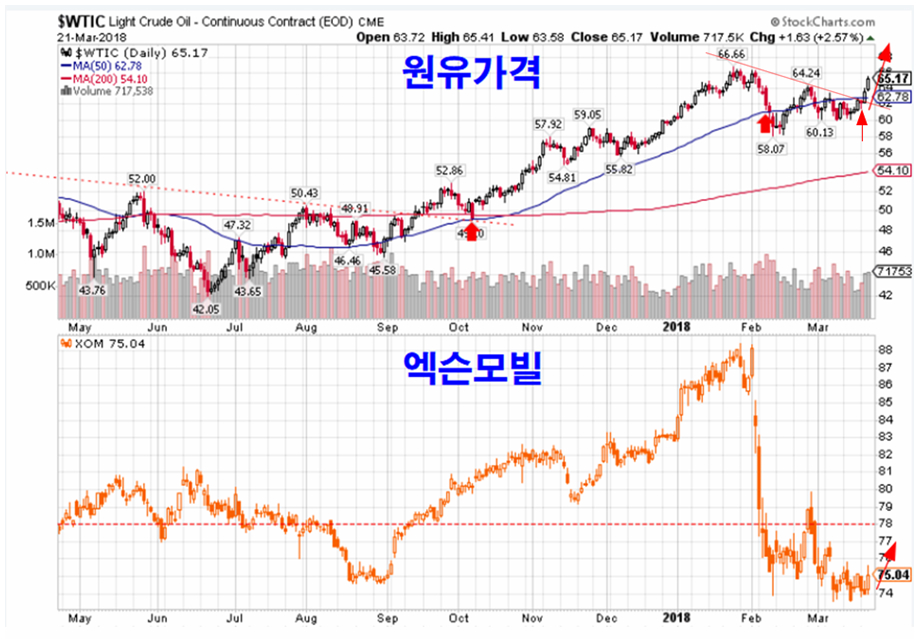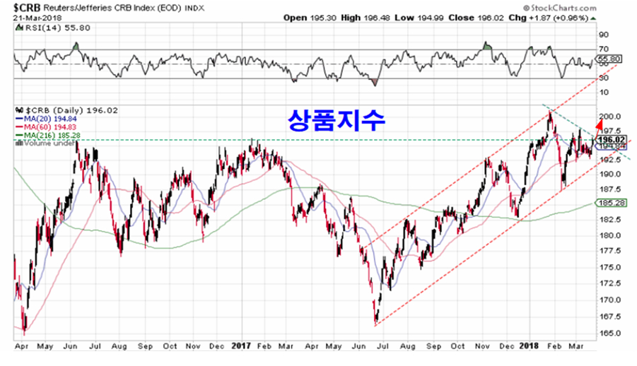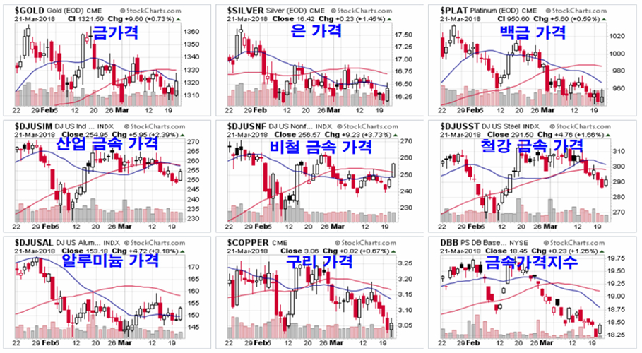 3월 21일 밤 뉴욕 시장에서는 금과 원유 그리고 금속이 크게 상승하였다. 원유와 석유기업 주가, 금속과 귀금속 가격과 관련 기업 주가는 2월 급락 이후 지루한 조정 과정이 이어져왔으나, 이날 상승으로 조정을 마무리하고 상승이 시작되는 듯 하다.