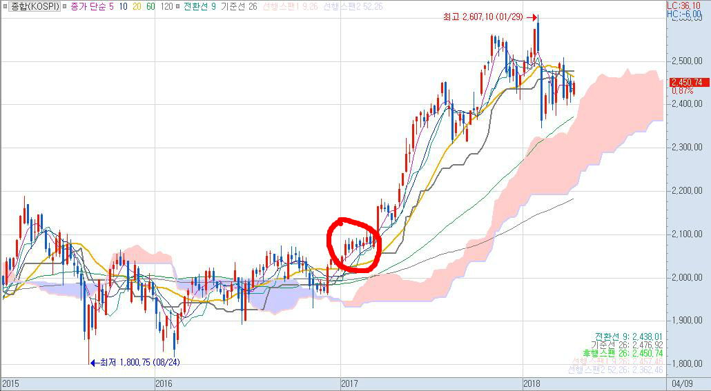 빨간색 동그라미가 바로 상승을 시작하는 자리이다. 이 자리에서 매수하는 방법만 알게