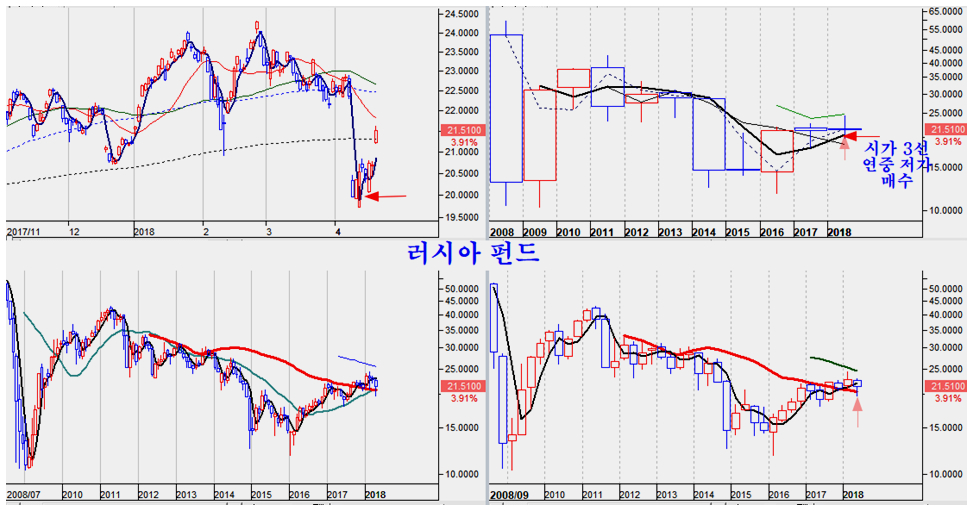 러시아 주가지수는 미국의 제재를 이유로 급락했지만 사실은 연봉의 이격 조정 과정이며 연봉 시가3선에서 저가 매수 기회를 만든 후 가볍게 회복되고 있다. 에너지와 가스가 오르고 곡물이 오르면 러시아는 제재와 관계없이 곡물과 에너지를 수출하는 러시아는 가장 번영하는 조건이 된다.