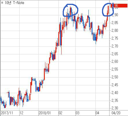 여기에다 미국 10년물 국채 수익률이 2.96%까지 상승하면서 찬물을 끼얹었다.