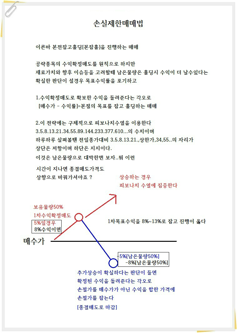 단,합산 매수가에 오면 반드시 매도해야 손실제한을 걸수 있으므로 1차매도50%[카페는 원샷투킬트레이딩]진행한뒤에는 통상적으로는 남은물량은 매수가도달시 필매도로 수익을 지켜야 하나 , 추가급등의 확률이 매우 높아 보이는 종목이라면 남은물량은 조금더 욕심내보는 매매법이라 할수있습니다.