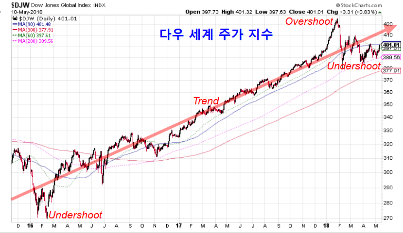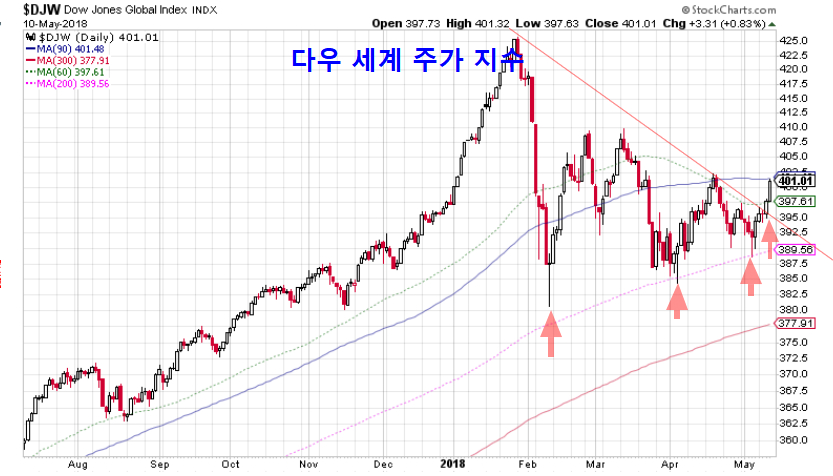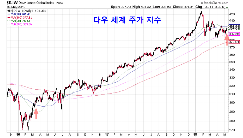 다우 세계 주가지수가 비교적 큰 조정을 거쳐 상승으로 돌아서는 것은 27개월 만이다. 2016년 초 2015년부터 하반기에 시작된 조정이 수개월에 걸쳐 이어졌지만 3월을 기점으로 상승으로 전환되었고, 그로부터 26개월이 지난 2018년 5월 다우 세계 주가지수는 4개월여의 긴 조정을 거친 후 상승이 시작되고 있다.