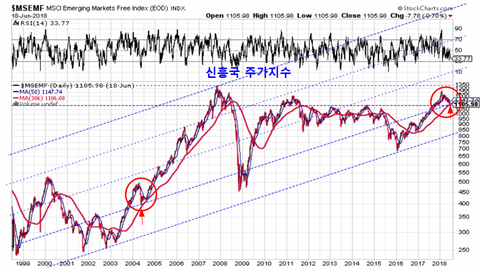 대세 추세 구도로는 1994년과 2014년의 20년 간격을 둔 저점을 잇는 대세 지지선으로 내려오면서 긴 시작을 마무리할 듯 하다.